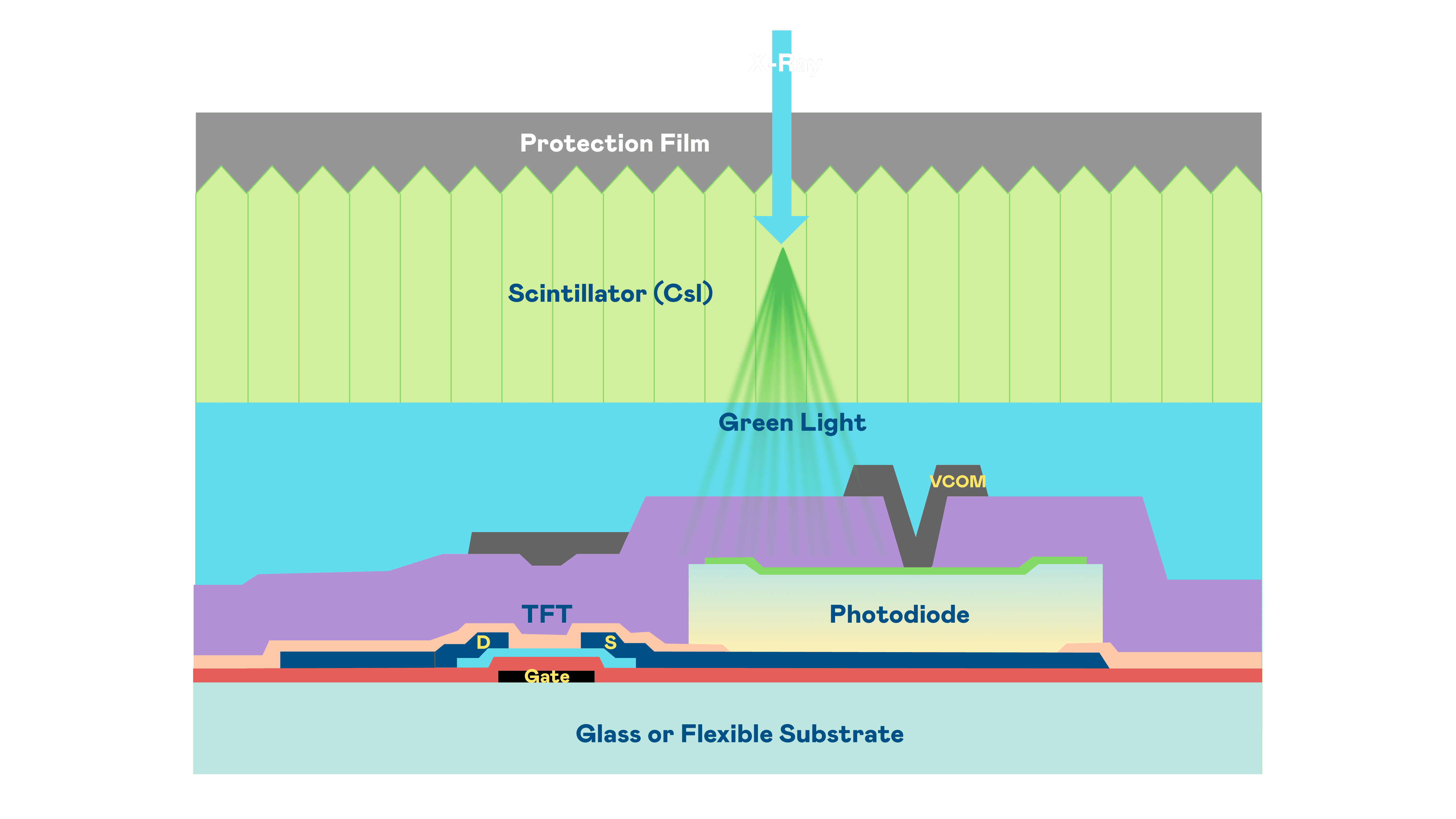 28国际的X光影像感测阵列使用薄膜电晶体 (TFT) 作为每个像素的读取开关,,,,搭配光电二极体(Photodiode)的光电转换元件,,,用以感测X光影像讯号。。。